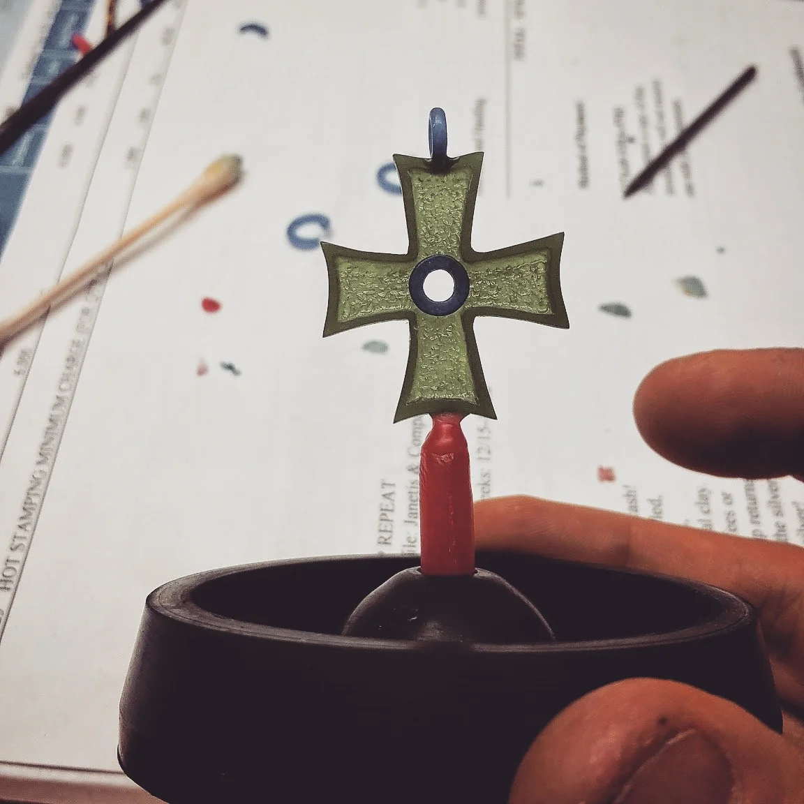 Wax carving of a new greek cross design for the Anastasis collection at J&Co. This cross will be cast in yellow gold and contain a 5mm almandine garnet cabochon as the center stone #janetiscompany #gold #greek #greekcross #cross #JEWELRY #jewelrydesign